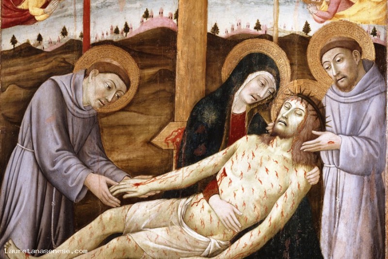 In the lower part of the table an inscription in capital letters shows the name of the painter ("OPVS. SANI. PETRI. DE SENIS. ME. PINSIT") and the date of execution of the work ("YEAR. DOMAINS. MILLECCCCLXXXI"). As already in the Crucifixion made for the convent of Santa Maria Maddalena, Sano di Pietro transforms the scene of the Lamentation over the dead Christ into a sort of heraldic emblem of the passion and death of Christ, on whose mystery the faithful were called to meditate exhorted by merciful gestures by Antonio da Padova (left) and Francesco d'Assisi (right): the participation of the two Saints in the painful event is to be related to the specific commission of the work, which we know performed for the Franciscan convent of the Capuchin Nuns of Siena. The symbolic value of the representation is accentuated by the presence, on the sides of the cross, of the instruments linked to the martyrdom of Christ, such as the spear and the barrel with the sponge soaked in vinegar; the figures of the Moon and the Sun, very recurring in the medieval Crucifixions, allude respectively to the Old and New Testaments: only in the light of the New Testament (symbolized precisely by the Sun) could the Old Testament (the Moon) be interpreted in its correct meaning, as a prefiguration of the coming, passion, death and resurrection of Christ. The painting is one of the last creations of Sano di Pietro that we know died in the same year (1481) to which the execution of the work dates: the languid and stereotypical expressions of the characters, accompanied by the slow and compassionate mimicry of the gestures, give the scene that pietistic intonation which constitutes one of the most recurring formulas of the figurative repertoire, however very limited, of our painter. However, the sense of general schematization, suggested by the same disinterest for an objective definition of the spatial planes of the composition, seems to escape the delightful piece of landscape that forms the background of the scene: the delicate combination of pink, green and blue tones and the happy invention of the round hillocks, manned by tiny towered buildings, qualify as one of the latest expressions of those whimsical and bizarre inventions developed by Sassetta and Pietro di Giovanni d'Ambrogio in the first half of the fifteenth century.