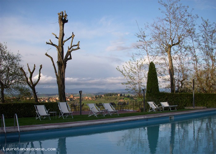 Nel verde del prato si inserisce la piscina scoperta, corredata di sdraio, lettini e tavolini.