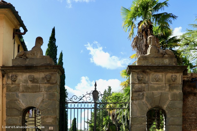 Due grandi sfingi accovolate in pietra serena, collocate sulla sommità delle due colonne all'ingresso della Villa il Pavone, residenza di  Ranuccio Bianchi Bandinelli e collocata subito fuori Porta Romana.