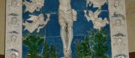 Inside there is represented a crucifixion with Mary Magdalene at the foot of the cross, kneeling in prayer