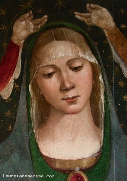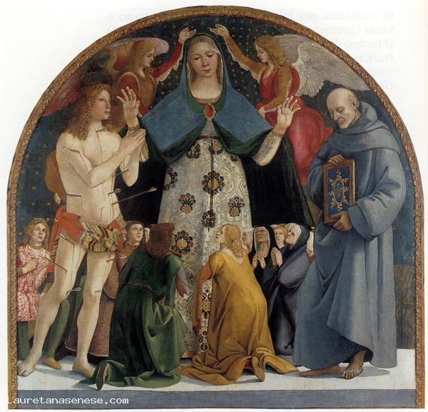 This altarpiece of the Madonna della Misericordia in the company of San Bernardino and San Sebasiano, after a first allocation to the Sienese Pietro di Domenico, is then recognized as the work of Signorelli. The board seems to have been painted immediately before (1487-1494) the completion of the cycle of frescoes in the Cathedral of Orvieto. Its original location seems to have been the headquarters of the Society of Mercy of Montepulciano. Originally it was to be linked to the dais in the Uffizi, in which are depicted: The Annunciation, The Adoration of the Shepherds and the Adoration of the Magi, as documented from Montepulciano. The not excellent quality of the implementation of the angels is interpreted as the work of employees of the master's workshop. In addition, the loss of gloss in some parts of the work is attributable to a long period of poor preservation of the table.