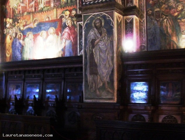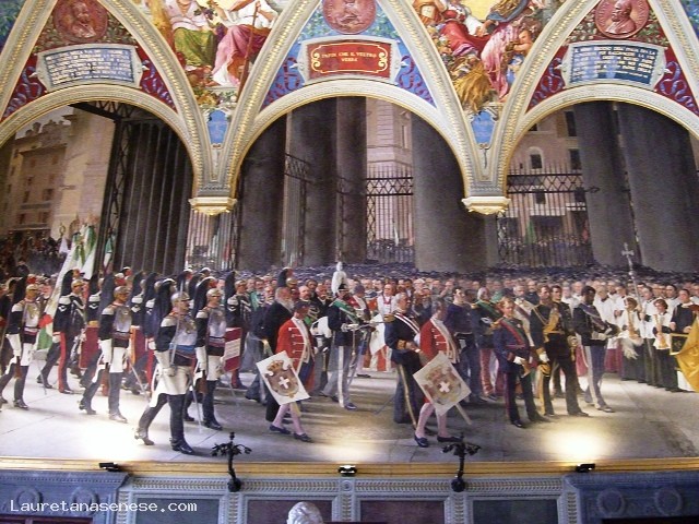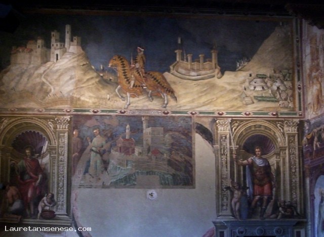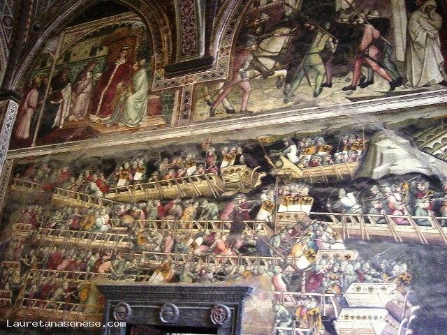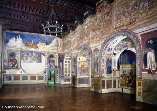 From the courtyard of the Palazzo Publico you access to the Museum, which houses beautiful paintings and sculpture along with paintings of extraordinary artistic and documentary value of the famous Sienese school of painting. Go up two flights of stairs at the entrance of the Halls was monumental, and turning immediately right you enter the room of the Globe, the main core of the building, having been a long time for meetings of the General Council of the Republic. The name comes from a lost painting by Ambrogio Lorenzetti rotating map, which depicted the ancient territory of the Republic. From this room began: the decoration of the Palace, is located on the back wall fresco by Simone Martini, the magnificent "Majesty" of 1312-15, still remarkable for the delicacy of chromatic chords, for the purity of the lines. And 'the first masterpiece of the famous painter, who on the back wall effigiò several years later in 1328 the portrait of the leader "Guidoriccio da Fogliano" conquerors of the Castle of Montemassi. Besides, the beautiful room of the Nine, where once met the Government of the Nine, who in 1337 commissioned Ambrogio Lorenzetti to decorate the room with the cycle of frescoes known as "The allegory of good and bad government." Returning to the room of the Globe, it passes to the left, nell'Anticappella, formerly used as a hall of the Consistory, ospitandone offices. In 1415 Taddeo di Bartolo, was commissioned to decorate it with a series of paintings of "Virtue and Of Famous Men." A beautiful gate closes the fifteenth century chapel, built early in the fifteenth century, much broader than that found on the ground floor, as it had to meet the new demands of a religious community that Siena was always more to increase. Of its decoration was still charged with Taddeo di Bartolo "Stories of Our Lady." The adjoining room to move or "Cardinals", introduces us to the Consistory Hall, with marble interior door Bernardo Rossellini. The frescoes on the ceiling, brilliant colors, are Domenico Beccafumi, whose subject us back again to the theme of justice and the love patriotism. Next to the Consistory Hall is the Hall of War or Priors, adorned with frescoes by Spinello Aretino, illustrating the "Life of Pope Alexander III of Bandinelli." Following the Hall of the Risorgimento, known as the Hall of Vittorio Emanuele II, inaugurated in 1890, whose walls are completely frescoed by Sienese painters of late nineteenth century, with episodes of the Unification of Italy. Upstairs is a large lodge, which looks to the south of the city. Finally, recently established at the adjacent rooms, houses the picture gallery, there are numerous frescoes, tables and paintings belonging to both the Sienese school and to other Italian and foreign artists.