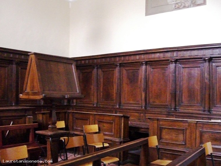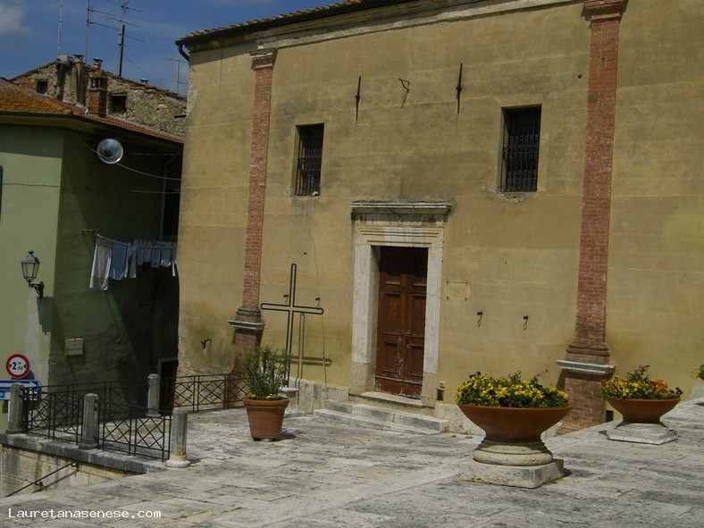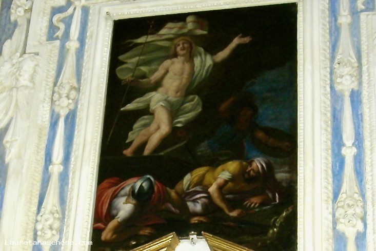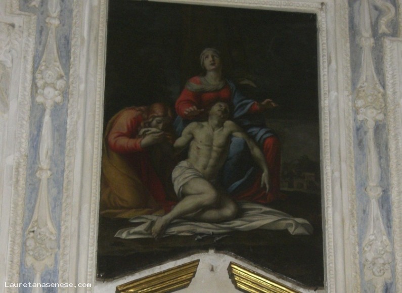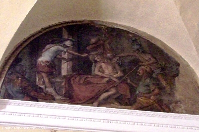 The oratory, once the meeting place of a laymen's organization no longer in existence, has homogeneous 17th-century furnishings and decorations all focused on the Passion of Christ. The theme is repeated both on the lunettes painted with frescoes by Francesco Nasini in 1660 as well as on the high altar designed by Bernardino Mei and Deifebo Burbarini in the same period. The beautiful wooden choir at the end of the oratory dates from the same time.