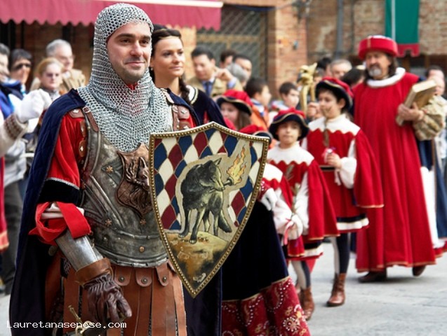 La festa, ormai diventata un tradizione, si svolge tutti gli anni la domenica successiva al 19 marzo. Alle 9 al suono delle chiarine ha inizio il Corteo Storico in costume, formato da quasi 200 figuranti. L'una dopo l'altra, le otto Contrade, precedute dagli Sbandieratori, entrano nella piazza, salutano gli ospiti e si dispongono in ordine con le spalle al Palazzo Comunale.