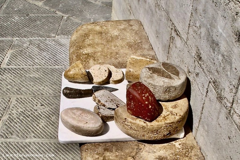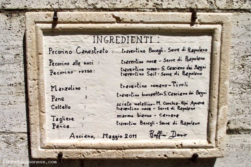This particular and small monument to local products, made of travertine, was conceived as a contemporary point of valuation of food excellence and travertine, available in the area, for the realization of small and sophisticated works of art.