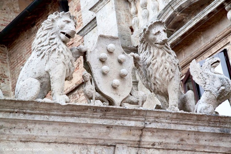 The sculptures on the lintel, would seem to represent: the two lions that dominates the republic of Florence, by the Medici (Medici coat of arms in the center), the City of Montepulciano (symbolized by two side griffins) .In addition the two sphinxes, on which the Medici coat of arms, should represent the arcane wisdom, decorative element very popular during the Renaissance.