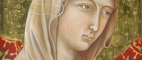 Tempera e oro su tavola,particolare del broccato rosso con motivo floreale finemente inciso a bulino sull'oro zecchino