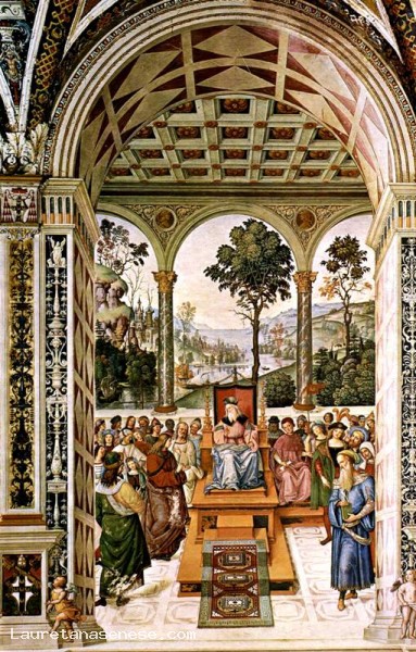 Behind the illustrious opens a grand loggia decorated old-fashioned, overlooking a stunning landscape. As is typical of Pinturicchio, the landscape is enlivened by some bizarre elements, such as the rocky spur on the left and the towered city along the river crossed by boats, characteristic symbol of Nordic environments. Traditional Umbrian are the slow sloping hills, bluish tones that fade in the distance due to the haze, and many deciduous trees, enlivened by lriflessi gold in the foliage.