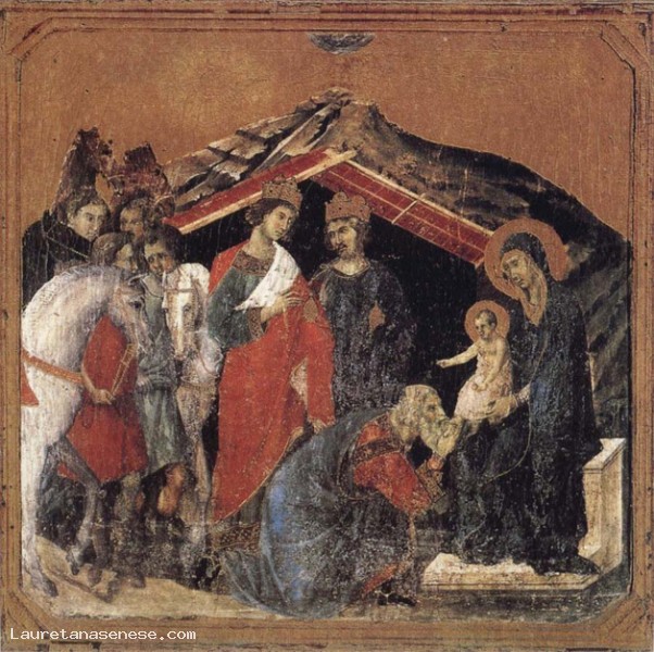 Tempera su tavola, cm. 42,5 x 43,5. In questa tavola, che chiaramente richiama le iconografie dell'arte bizantina, si percepiscono, soprattutto nelle figure - compresi i cavalli - poste al lato sinistro, preludi di notazioni da società 'cortese'.
