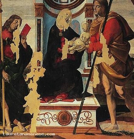 San Cristoforo, with big and clumsy hands, is on the left of the Virgin, in the act of welcoming the Child in her arms.