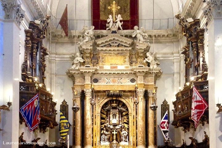 In the basilica is traditionally brought the drapery won after the Palio of 2 July by the procession of the winning district.