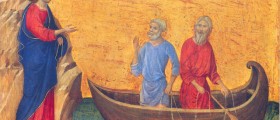 "La vocazione di Pietro e Andrea" è un dipinto autografo di Duccio di Buoninsegna appartenente alla predella della Maestà del Duomo di Siena, realizzato con tecnica a tempera su tavola nel 1308-11, misura 43,5 x 46 cm. ed è custodito ad Washington nella National Gallery of Art.Il modello della presente composizione è relativo a quello bizantino. La novità sta nell'intensa corrispondenza dei personaggi che, pur isolati nei loro singoli atteggiamenti, conferiscono all'ambiente che li circonda la travolgente "atmosfera" del richiamo di Cristo.
