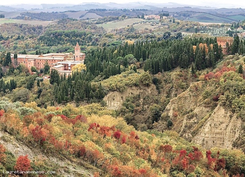 Percorso agevole che partendo da Asciano verso Chiusure attraverso la strada provinciale per San Giovanni d'Asso, raggiunge le alture del Pecorile da cui si gode una splendida vista sulle Crete, che nelle belle giornate asciutte permette la vista di Siena all'orizzonte. Più avanti si gira a destra al bivio per Chiusure e dopo non molto si raggiunge la località suddetta, dalla quale si può volgere lo sguardo sul deserto di Accona e la sua splendida gemma: l'Abbazia di Monte Oliveto Maggiore. Riprendendo il cammino in discesa verso l'Abbazia, si giunge al bivio di Poggio alle Monache. Prendendo a destra ci si incammina nuovamente verso Asciano con un percorso caratterizzato da continue salite e discese. Toccando località caratteristiche come Il Palazzaccio, Palazzo Venturi o Montecontieri che dir si voglia e poi Palazzo Monaci, originariamente Grancia dei monaci di san Galgano, si arriva nuovamente ad Asciano.Prima, però, ci si può soffermare a guardare il panorama del paese dall'alto.