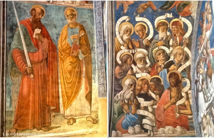 Infine, nell'intero sotto arco si trova il "Salvatore con ai lati Patriarchi e Profeti del Vecchio Testamento" e nei piedritti: a sinistra i "Santi Pietro e Paolo", a destra le "Sante Flora e Lucilla".
