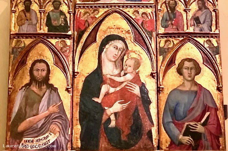Pala a trittico mancante delle decorazioni della cornice, immagini incorniciate da finestra ogivale triloba con angeli affacciati ai lati. Madonna con Bambino, san Giovanni Battista, san Giovanni Evangelista, angeli e santi, storie della vita della Madonna