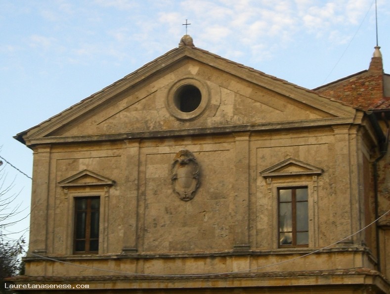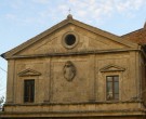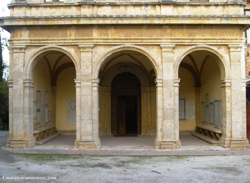 La facciata della chiesa è preceduta da un porticato a tre arcate eseguito su progetto, come tutta la fronte, di Ippolito Scalza.