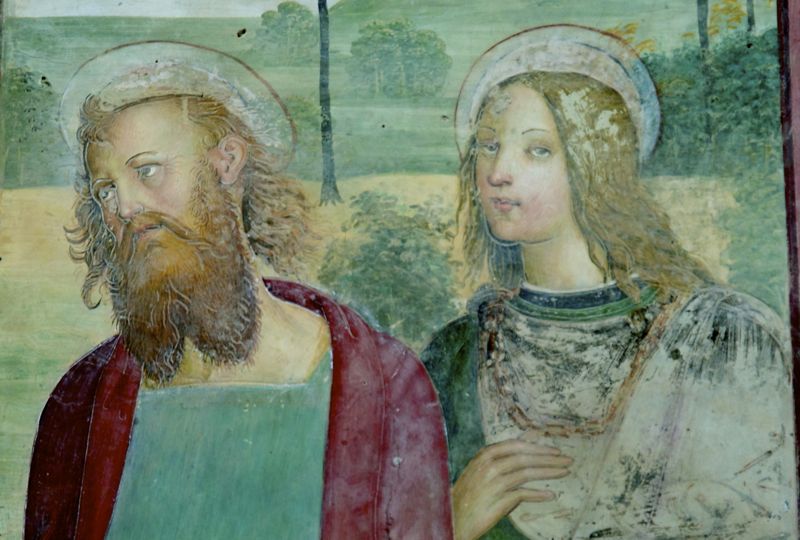 Ebbene dalla sovrapposizione dei tratti somatici, tra questo viso e alcuni autoritratti si nota la somiglianza alquanto stupefacente con Raffaello; basti vedere la forma degli occhi, il profilo del naso, la linea del mento o il contorno del volto. Ma perché un affresco così pregevole, in una piccola pieve di provincia? La presenza di Raffaello a Siena risulta documentata, in quanto Pinturicchio invitò Raffaello, ancorchè diciassettenne ma già magister, a collaborare agli affreschi della Libreria Piccolomini, interna al Duomo di Siena.