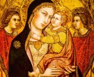 Tempra su tavola. ogni scomparto 141x88 cm. Cuspidi 57x35 cm. Grandioso polittico privo di cornice dove vi sono abbinati soggetti di vari autori: la Madonna al centro è attribuita a di Taddeo di Bartolo,ii quattro santi ai lati: S.Agata, S.Pietro, S.Paolo e S. Giovanni Battista sono invece di Andrea di Bartolo e i quattro evangelisti in alto vengono al momento attribuiti a Paolo Fei o Taddeo di Bartolo.