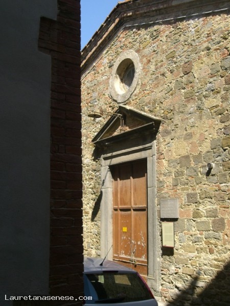 L'interno, ad un'unica navata, ha sulla parete di fondo tre altari in stucco della seconda metà del Seicento. In quello di destra è l'affresco con la Madonna col Bambino in trono e i Santi Giovanni e Rocco (seconda metà del XV secolo); in quello di sinistra è il dipinto seicentesco con Santi adoranti la Croce, probabilmente di Antonio Nasini. Sulla parete sinistra si trovano l'altare in stucco della Madonna del Carmine, dove era inserita la tela con la Madonna del Carmine del Rustichino, ed un secondo altare dove si trovava la grande pala di Benvenuto di Giovanni. Le due opere sono adesso conservate nella Collegiata.