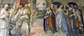 Lo sfondo presenta un magnifico scenario architettonico e la scena presenta le persone divise in due gruppi: a destra le giovani donne, alcune danzanti e sulla sinistra i monaci con san Benedetto. Forse il miglior affresco del gruppo, con notevoli influssi leonardeschi.