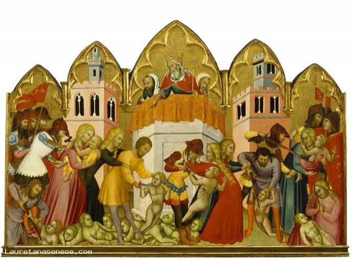 Per ostacolare in tutti i modi che la profezia della nascita di un nuovo Re si compisse, il Re Erode ordinò ai suoi soldati di uccidere tutti i bambini maschi, sotto i due anni di età che fossero nati a Betlemme. Essi eseguirono l’ordine con spietata efficienza.