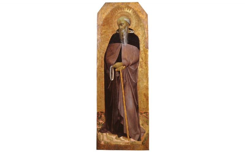 ​Insieme al bastone e alla campanella, attributi dell’iconografia del Santo, Antonio Abate tiene nella mano sinistra il circulum precatorium, oggetto che per la forma e la funzione può essere assimilato al rosario di epoca moderna. Come lascia intendere la struttura del supporto ligneo, la tavola costituiva in origine il pannello laterale destro di un polittico a più scomparti: nello spessore sinistro del dipinto sono infatti le tracce dei fori in cui erano inseriti i pioli che servivano da elementi di raccordo fra i singoli pannelli del complesso pittorico.  In considerazione della particolarità dei caratteri stilistici, il dipinto è stato a lungo ritenuto dalla critica come uno dei pannelli del Polittico dell’Arte della Lana, capolavoro realizzato dal Sassetta intorno al 1426 e visibile ancora nel XVIII secolo nella Cappella dell’Arte della Lana annessa alla antica chiesa senese di San Pellegrino alla Sapienza: secondo l’accurata descrizione datane nel Settecento dall’abate Gian Girolamo Carli, del polittico — successivamente smembrato e in parte disperso — faceva parte una tavola raffigurante Sant’Antonio Abate.  Negli ultimi anni tale ha perso consistenza dal momento in cui si è individuato, quale sicuro pendant del Sant’Antonio, una tavola del tutto analoga nel formato e nella decorazione a punzoni dell’aureola del Santo, raffigurante San Nicola di Bari acquistata nel 1981 dal Museo del Louvre di Parigi.Il dipinto, nello spirito che è proprio dell’arte del pittore, è intessuto da una fitta trama di suggestioni spaziali: al chiaroscuro morbido e soffuso, che costruisce il volume tornito della figura, fa riscontro lo scorcio sapiente del rosario e dell’impugnatura del bastone del santo che, a loro volta, indicano le direttrici entro cui viene a svilupparsi lo spazio della composizione.​​