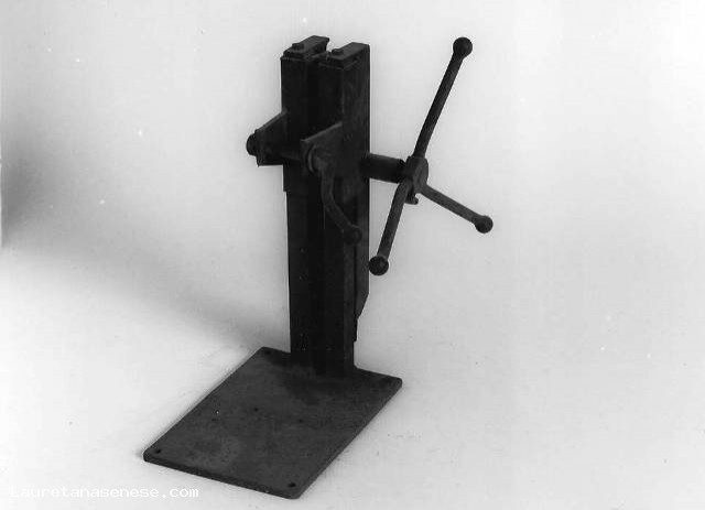 Torretta su cui poggiare una testa di trapano, presumibilmente del tipo elettrico portatile, per poter effettuare buchi di precisione su pezzi appoggiati sulla base