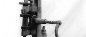 Un trapano di questo genere veniva piazzato normalmenrte su un banco che serviva come piano di appoggio per la foratura.